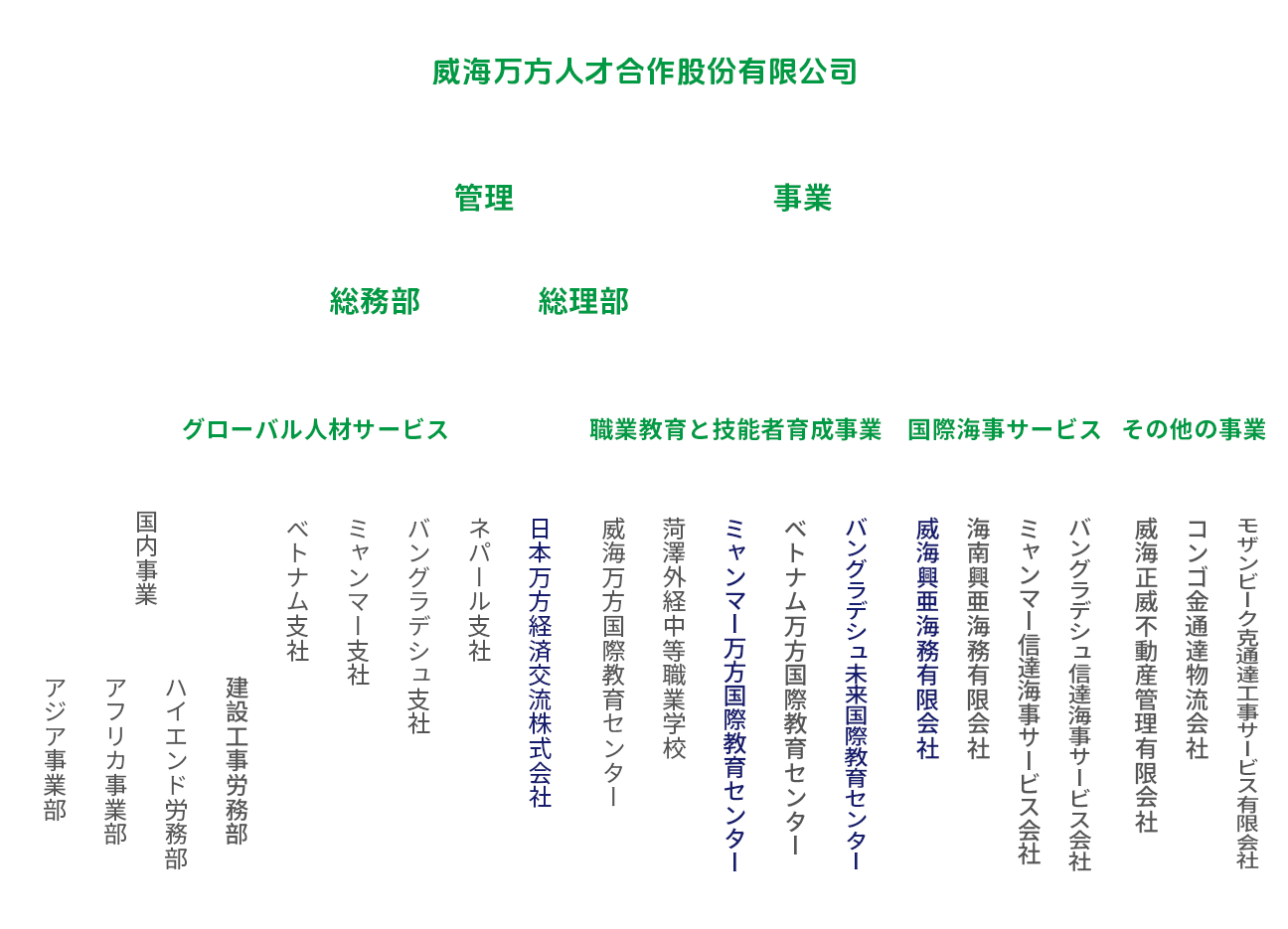 當(dāng)社の事業(yè)內(nèi)容は、國(guó)內(nèi)外の人材派遣サービス(海外労働者送出事業(yè)を含む)、職業(yè)教育訓(xùn)練、國(guó)際海事サービス、不動(dòng)産管理サービス、國(guó)際貿(mào)易、資本運(yùn)営等、多岐にわたる分野に及んでいます。當(dāng)社は2017年に持株制度への仕組み変更を?qū)g施し、2018年6月に全國(guó)中小企業(yè)株式譲渡システムに上場(chǎng)し、正式に資本市場(chǎng)に進(jìn)出しました(証券コード:872813)。
